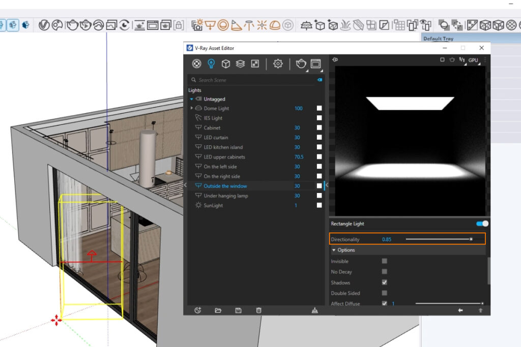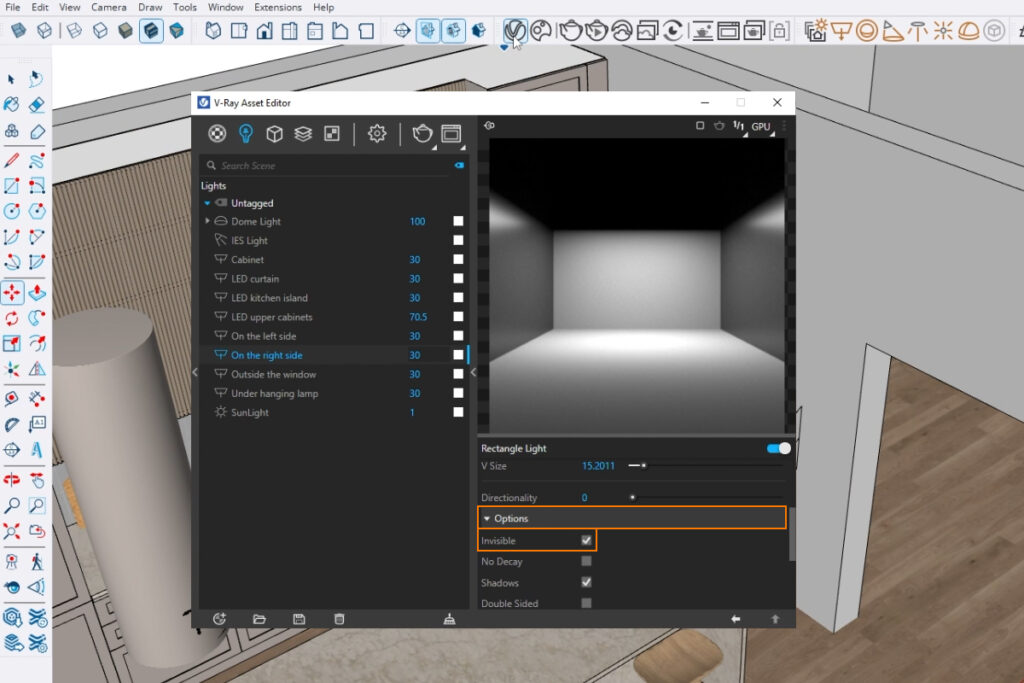 Niewidzialne światła prostokątne świetnie nadają się do rozjaśniania ciemnych obszarów bez widocznego źródła światła na wizualizacja.