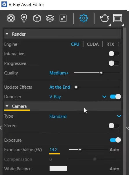 W ustawieniach renderu możesz zmienić wartość ekspozycji, czyli rozjaśnić albo przyciemnić wizualizacje. Wartość domyślna expozycji (exposure value) to 14.2. Jeżeli zmienisz wartość np na 12, to scena będzie jaśniejsza. Jeśli zmienisz wartość na 15, to będzie ciemniejsza.