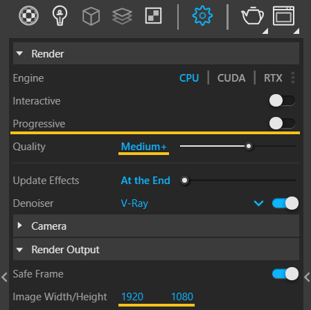 Ustawmy jakość wizualizacji na medium + / high / high +. Wyłączam progressive render.