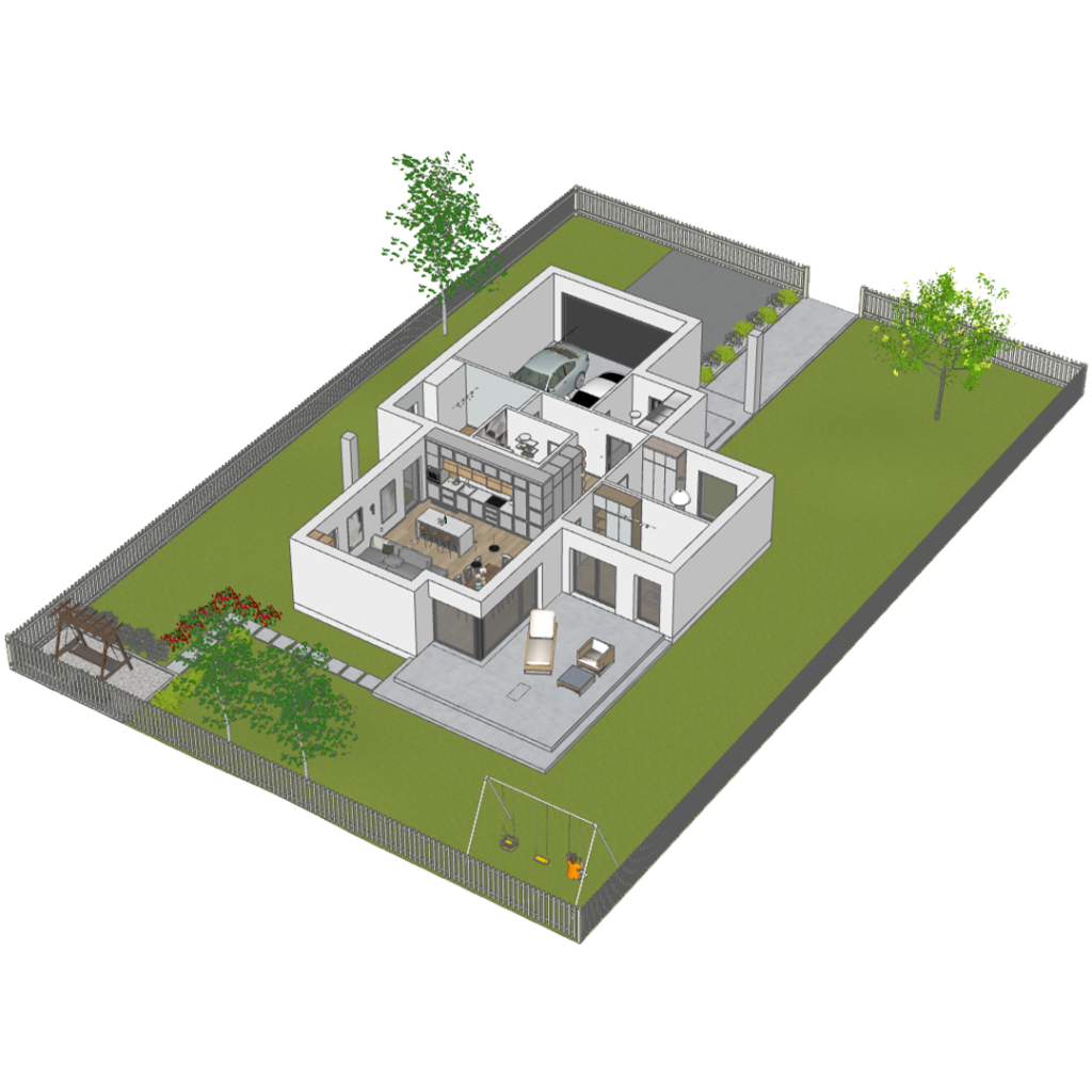 Oprócz zamodelowania wnętrza, stworzysz bryłę budynku razem z ogrodem. Zaprojektujesz otoczenie wraz z drzewami, krzakami, kwiatami. Stworzysz nawierzchnie betonową, kamienną i trawiastą.