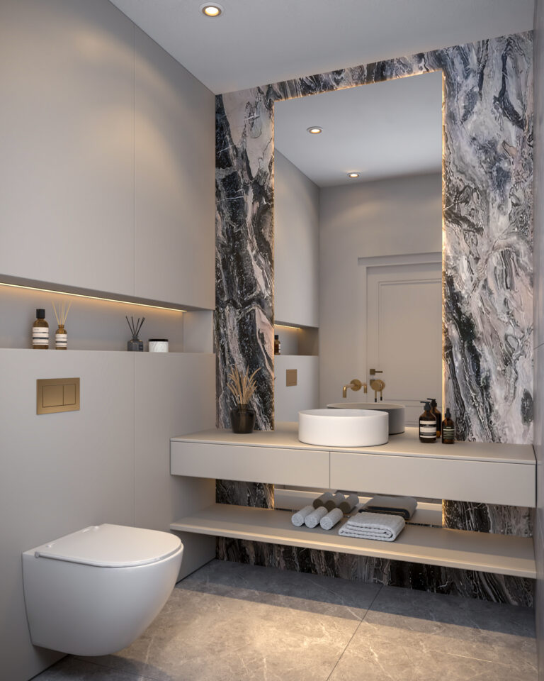 Jest to łazienka bez okien, dzięki czemu zobaczysz w praktyce, jak poprawnie oświetlić wnętrze pozbawione światła dziennego i uzyskać realistyczny efekt.