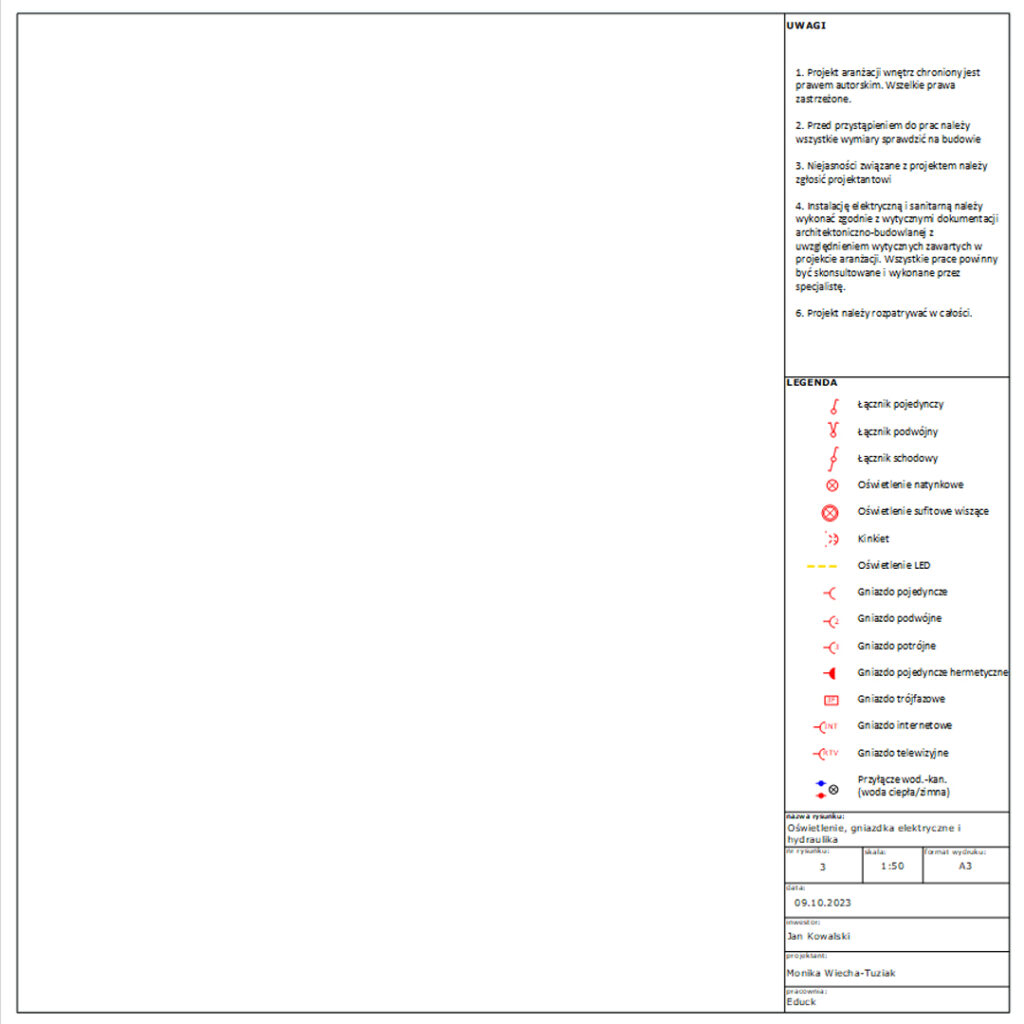Stworzysz tabelkę ze wszystkimi potrzebnymi informacjami takimi jak legenda, informacje o projekcie i symbole.