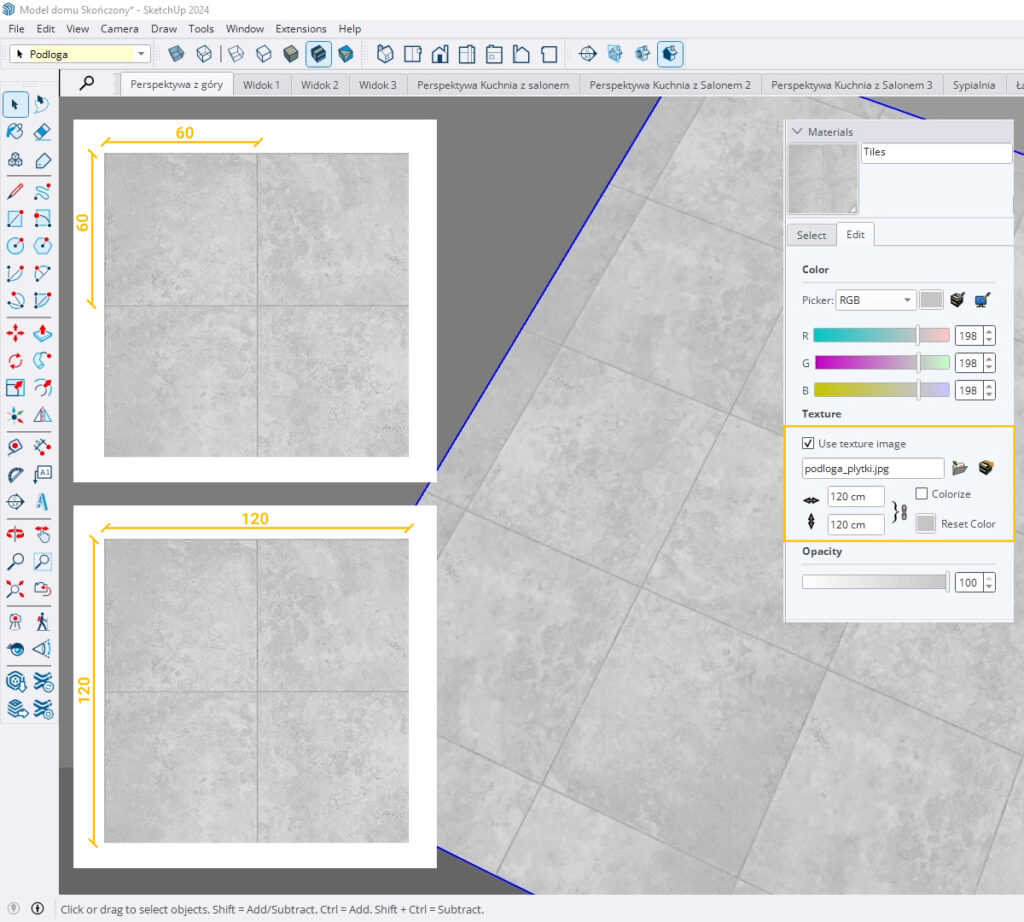 Nakładanie Materiału Płytek: Pokażę to na przykładzie nakładania materiału płytek na wybraną powierzchnię. W zakładce Edycja można określić rozmiar tekstury. W przypadku mojej tekstury płytek, chcę, aby każda płytka miała 60 cm, więc cała tekstura powinna mieć wymiary 120×120 cm. Teraz płytki mają prawidłowy wymiar 60 cm. W zależności od tekstury, możesz dostosować jej rozmiar, aby uzyskać dokładne wymiary potrzebne dla płytek lub paneli.