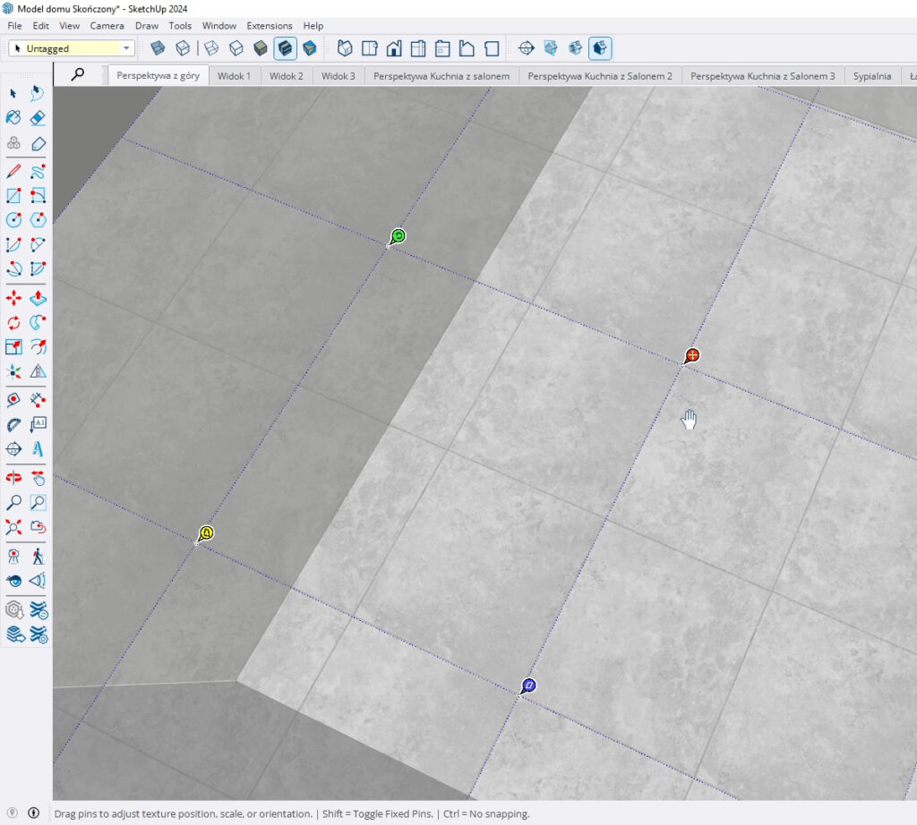- Używanie Zielonej Pinezki: Za pomocą zielonej pinezki możesz obracać lub skalować teksturę. Najczęściej używam tej pinezki do obracania tekstury. Do skalowania tekstury zawsze używam okna Materiały w Zasobniku Domyślnym po prawej stronie ekranu.